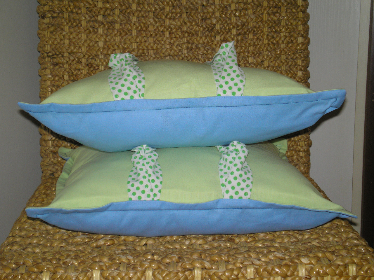 Povlak na polštářek je ušitý ze 100% bavlny, předem vysrážené. Přední díl - světle zelená, zadní díl světle modrá, zapínání na jeden knoflík. Ozdoba - kšandy, zelený puntík, velké knoflíky.